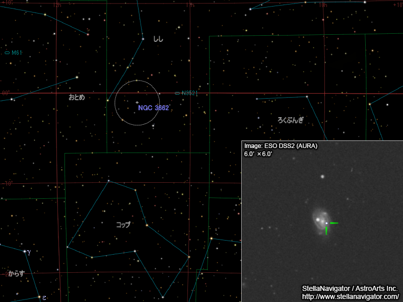 NGC 3662周辺の星図と、DSS画像に表示した超新星。クリックで拡大(「ステラナビゲータ」で星図作成。DSS画像の版権について)