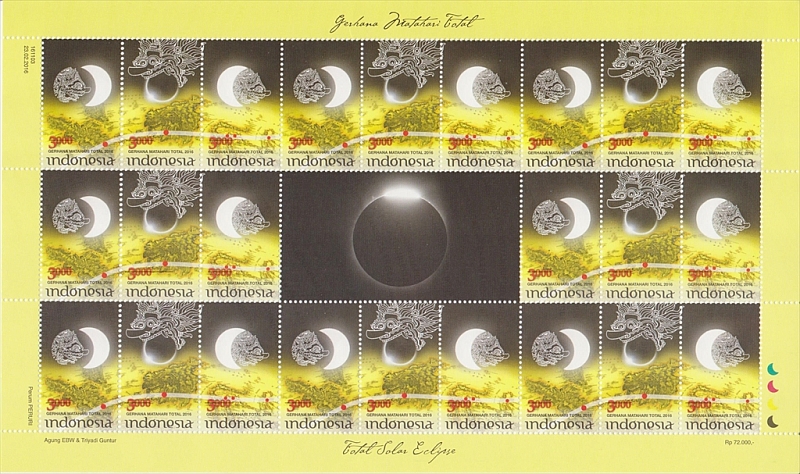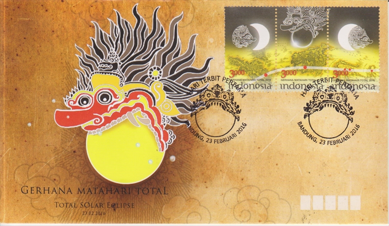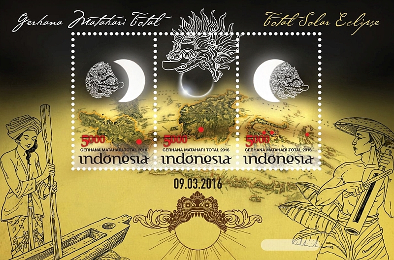 3月9日の皆既日食に合わせて発売される切手類は、切手3枚組(9000セット限定)が5000ルピア(約42円)、24枚組切手シート(300000セット限定)が3000ルピア、切手3枚を貼付したレターセット(初日カバー入り、3000セット限定)が3000ルピアの3種類。ヒンズー教の神バタラ・カラが太陽を呑み込みことによって日食が起こるとするジャワ地方の伝説がデザインされている。