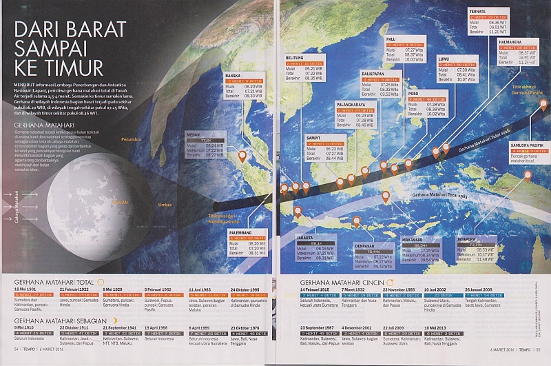大手週刊誌「テンポ」の最新号(3月6日号)誌面。12ページにおよぶ皆既日食特集を掲載。クリックで拡大(© Tempo Inti Media)