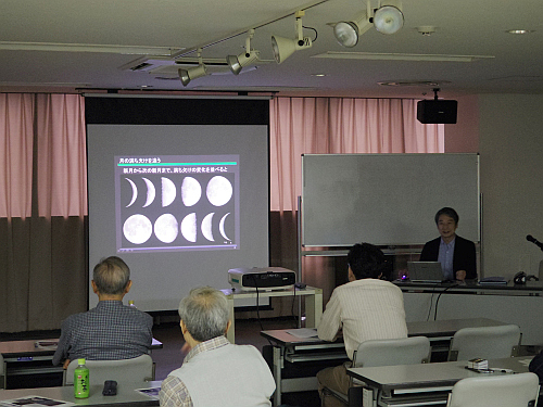受講者は月の撮影画像がクリアになっていく画像処理のデモを興味深く見ていました。そして最後はクレーターや光条、谷や断層、海のシワなど、月面の複雑で興味深い地形を、講師自らが撮影した画像を使いながら地質学的な面からも解説して講座を締めくくりました。受講した方からは、惑星の撮影や画像処理方法も知りたいという声も聞かれました。