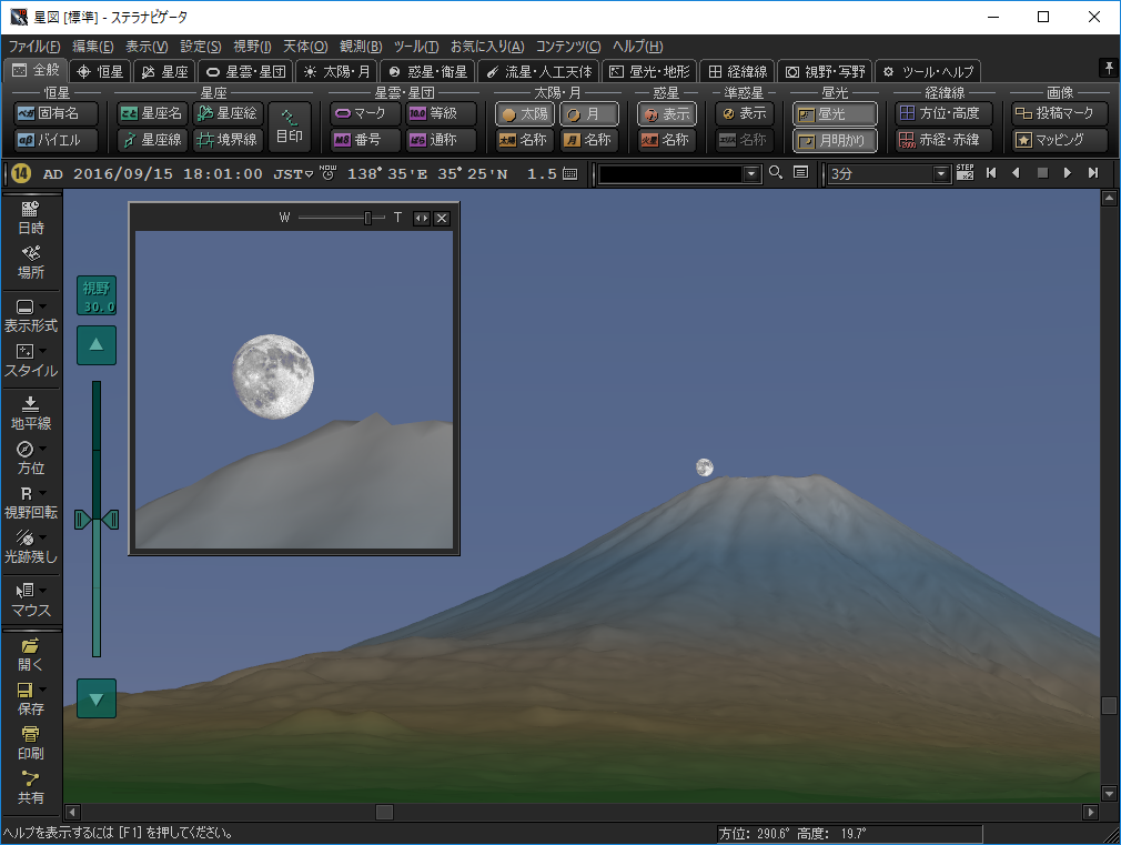 2016年9月15日、静岡県富士宮市朝霧高原付近から見える中秋の名月を星図に表示。クリックで拡大