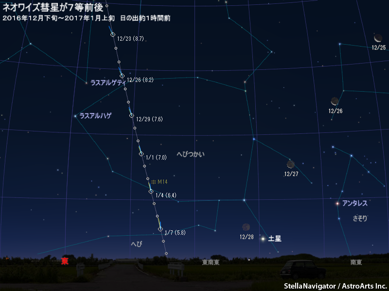 2016年12月下旬から2017年1月上旬、明け方の東の低空にネオワイズ彗星(C/2016 U1)が見えている。1月14日の近日点通過に向け明るくなっており、6~7等まで達すれば双眼鏡で見えるかもしれない。日の出1時間前(東京で5時50分ごろ)の高度が10度前後とかなり低いが、見晴らしの良いところで見たり撮ったりしてみよう。