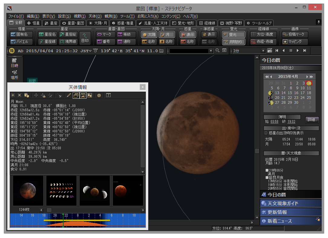 ステラナビゲータ10で再現した2015年4月の月食(クリックで拡大)