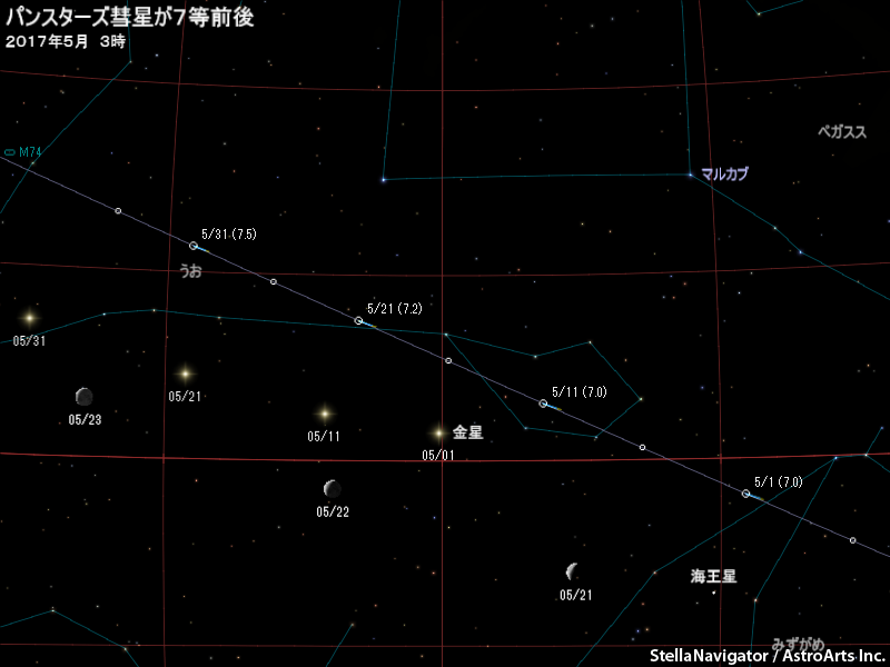 5月の見え方(場所の設定は東京)。日付横の括弧内は予想等級。彗星は模式的に表現している。クリックで星図拡大
