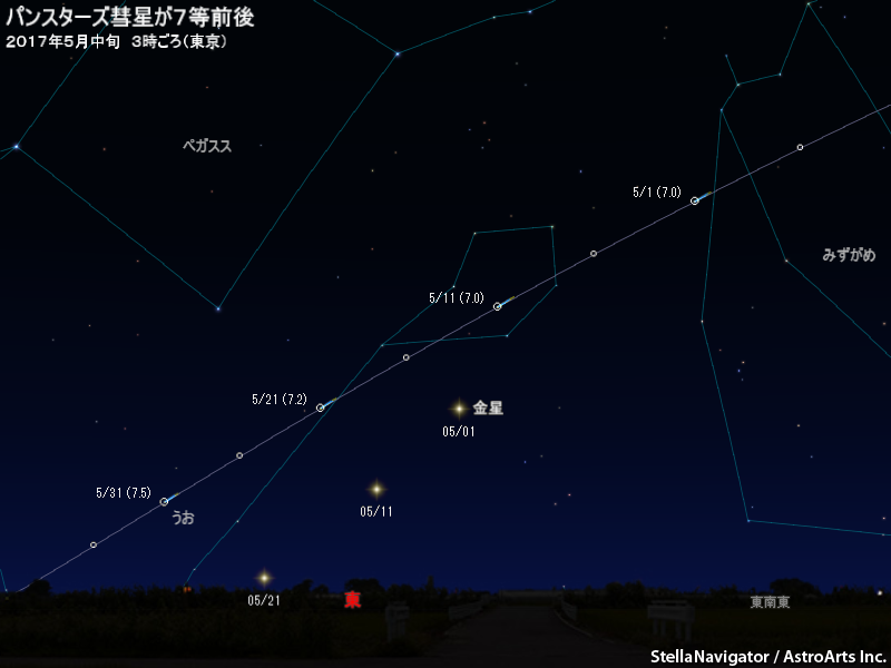 4月に引き続き5月も、パンスターズ彗星(C/2015 ER61)が明け方の東の空に見えている。7等前後と予想されるが、4月上旬の増光からどのような変化を見せているか注目したい。やや離れたところに明けの明星の金星が輝いているので、それを目印に彗星を探して、双眼鏡や天体望遠鏡で観察したり撮影したりしてみよう。