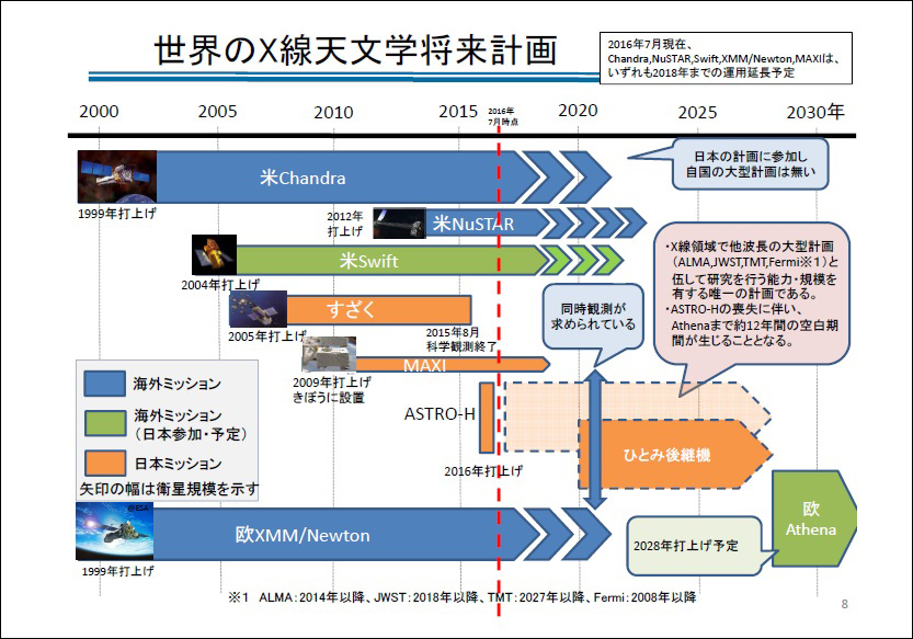 日本は1979年からこれまでにX線天文衛星を6機打ち上げており、宇宙の謎の一端を解明する多くの科学的成果を挙げるなど世界のトップランナーとしてX線天文学の分野を牽引してきた。 日本がリードする国際協働プロジェクトとして今年2月に打ち上げられた「ひとみ」には、世界唯一の大型X線天文衛星としての活躍が期待されていた。従来より広帯域かつ10倍以上の感度を持つ検出器を搭載しており、暗黒物質の謎や銀河とブラックホールの共進化の謎に挑む予定だったが、それはかなわなかった。