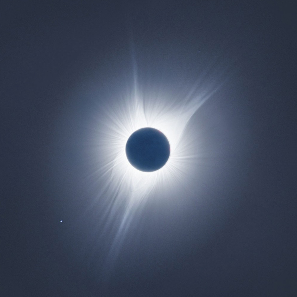皆既食。太陽左下の光点はしし座のレグルスで、皆既中は双眼鏡でコロナとともにはっきりと見えていた(撮影:アストロアーツ 川口雅也(ティトンビレッジにて)+上田敬司(ドリッグスにて))