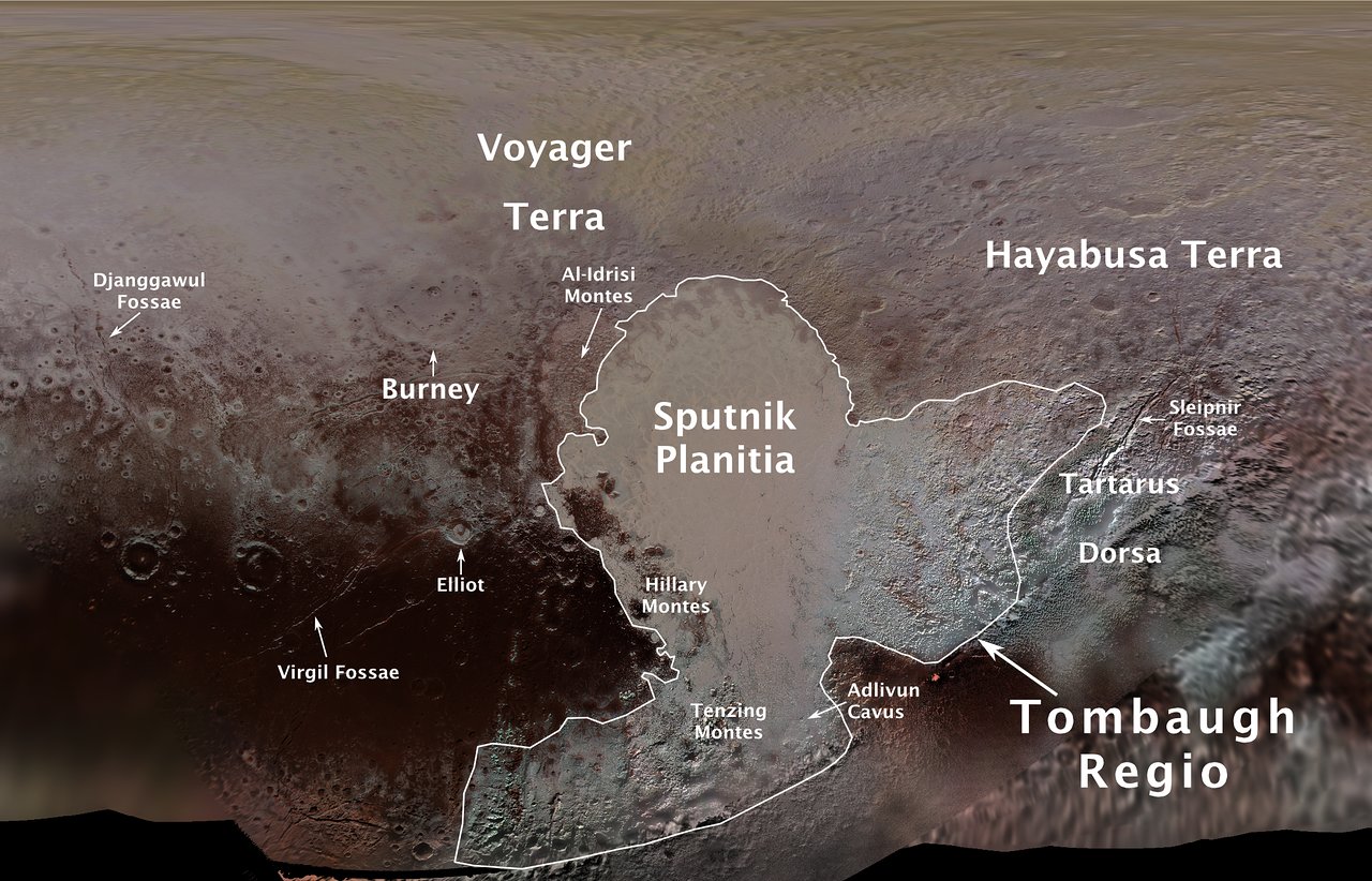 - 「スプートニク平原(Sputnik Planitia)」:ソビエト連邦の人工衛星「スプートニク1号」。1957年に打ち上げられた世界初の人工衛星