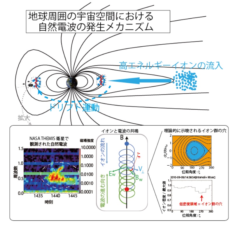 高度400kmから約10万kmの地球周囲の宇宙空間(ジオスペース)にはプラズマが存在している。ジオスペースのプラズマからは様々な電波が発生しており、プラズマの分布やエネルギーを変えてしまうことが知られている。特に周波数1Hz程度の「電磁イオンサイクロトロン波動」と呼ばれる電波は、放射線(放射線帯の電子)の分布を変えたりオーロラの発生に寄与したりすると考えられている。しかし、プラズマの中から電波が発生する瞬間が観測されたことはこれまでなかった。