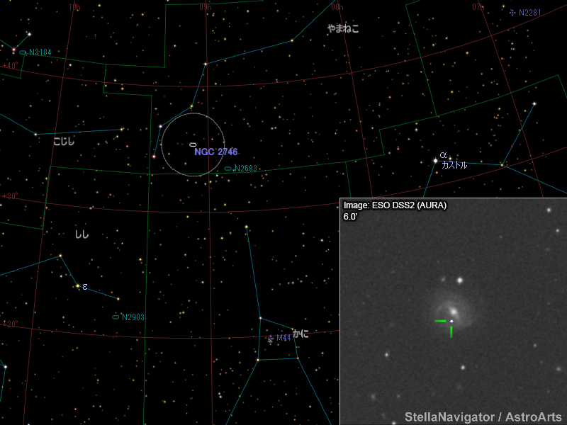 NGC 2746周辺の星図と、DSS画像に表示した超新星。画像クリックで星図拡大(「ステラナビゲータ」で星図作成。DSS画像の版権について)