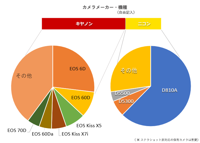 カメラについては、「ステラショット」がキヤノンおよびニコンのデジタル一眼レフカメラのみの対応であることから、この2メーカーの比較となりますが、キヤノンが2に対してニコンが1の割合となっています。キヤノンでは、フルサイズ普及機のEOS 6Dが多く、APS-Cサイズ中級機のEOS 60Dが続きます。ニコンで目立つのは、Hαを放つ赤い散光星雲が圧倒的によく写るD810Aが非常に多く、絶対数ではキヤノンのEOS 6Dと肩を並べるほどです。またD810Aを使っている方の中には、キヤノンのカメラも同時に保有している方が多いのも特徴です。