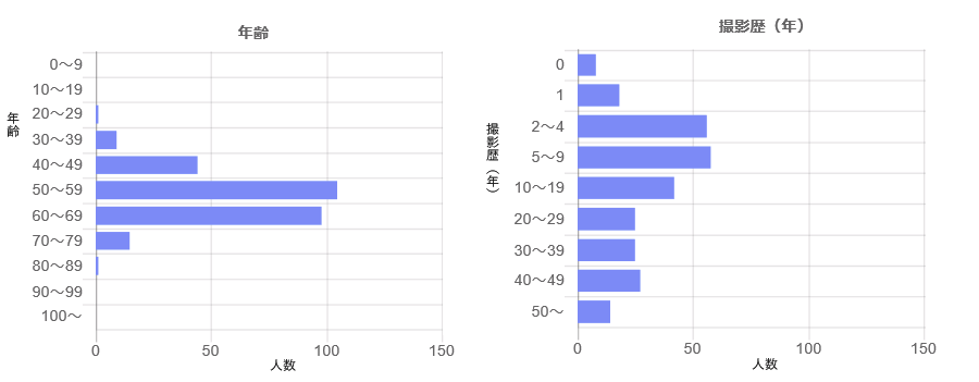 最も多い年齢層は50代、次いで60代であり、この2つの世代で全体の3分の2を占めています。「ステラショット」での主なターゲットである星雲・星団の撮影は、この年代の方が特に熱心に取り組んでいることがうかがえます。また、撮影歴は10年未満の方が最も多く、子育てが一段落したり、定年を迎えてから始めたりした方が多いことが推測できそうです。