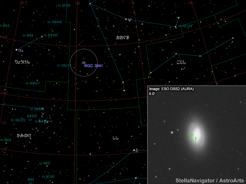 NGC 3941周辺の星図と、DSS画像に表示した超新星。画像クリックで星図拡大(「ステラナビゲータ」で星図作成。DSS画像の版権について)
