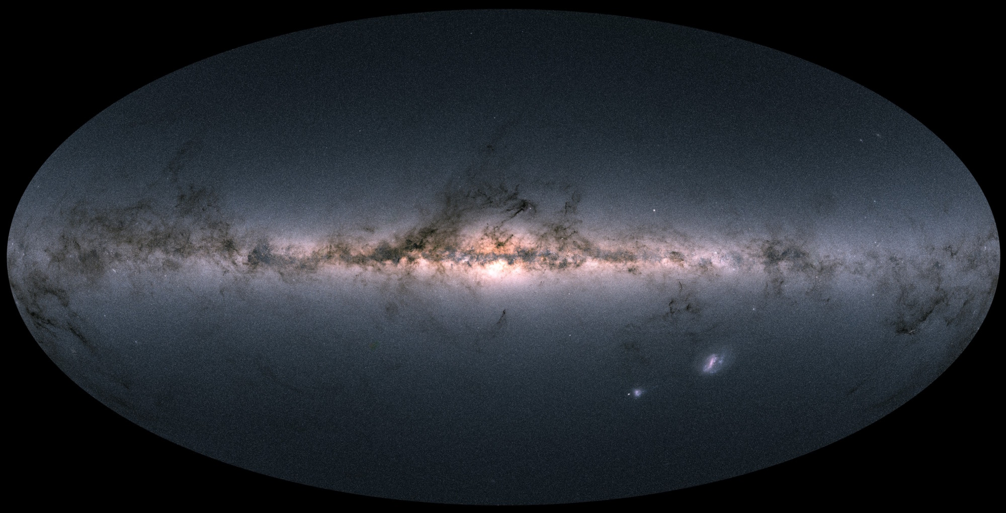 ガイアカタログの17億個の恒星データをプロットして作成した天の川銀河の全天図。銀河面に重なっている暗い領域は星間ガスと塵からなる雲。画面右下の星の集まりは大小マゼラン雲。画像クリックで表示拡大(提供:ESA/Gaia/DPAC)