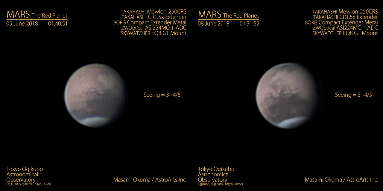 6月5日・8日の火星(北が上)。画像クリックで表示拡大(撮影・提供:アストロアーツ 大熊正美)