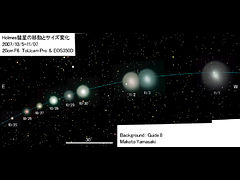 (1枚目)10日間にわたり撮影したホームズ彗星の移動と大きさの変化を、1枚の画像上に合成したものです。急激に大型化し、コマの形状がみるみる変化していく様子がわかります。