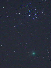 静岡市街地から30分程度の山の中ですが、すばるの横にすぐ存在がわかりました。どう頑張っても肉眼では尾は見えませんでしたが、写真に撮るとイオンテイルがはっきりと写りました。流星もわりと多く見ることができました。