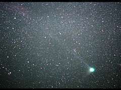 晴れ間を求めて移動する。降っていた雨もあがり雲の間から星がチラチラ見える。撮影場所の選択…。撮影場所へ向かう途中、季節外れの濃霧。一面、真っ白の中…ひたすら撮影場所へ…。撮影場所に到着すると晴れている。しかし、数コマ撮ると雲が拡がりはじめる。月明かりの影響を受けない夜として最後の撮影です。尾は、依然5度程度確認できる。コマは、少し小さくなってきたように思います。再び、濃霧のなか帰路につきました。