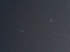 (1枚目)3/10の撮影が失敗したので、休日を利用して遠征し再挑戦。原版を見ると、尾がまだ伸びているようです。4×22双眼鏡ではほとんど恒星状、10×50ではっきり彗星状に見えます。