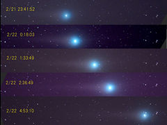 100cm×26倍双眼鏡で光度5等星、コマ25分と大きく、尾が楕円形に東に伸びています。また 5分ほど眺めていると彗星の移動が確認できます。