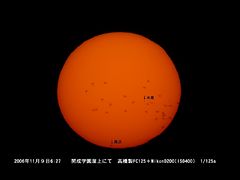 日の出から撮影を始めましたが、大気の揺らぎのために像が乱れ、小さな水星は見えませんでした。このコマからようやくかすかに水星が見えだしました。ノーフィルターでの撮影です。
