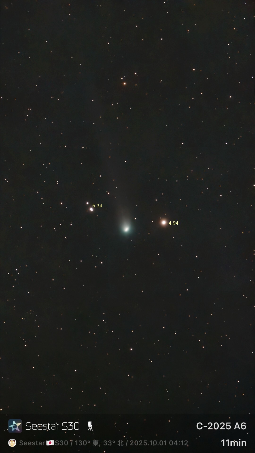 夜中3:30に目覚めて、空を眺めたら、全天に薄雲があるものの、北東方向は雲が切れていたため、 急いで、Seestar S30とスマホだけを持って、車で出発。 到着したら、テーブルの上にSeestarS30をポンと乗せて、スイッチオン。 そして、C/2025 A6をSeestar スマホアプリで検索。 数分で、自動でアライメント(経緯台モード)が完了して、ど真ん中に彗星を自動導入してくれました。(超ラクチン) 11分間、露光したため、彗星が少し流れてしまいました。(恒星追尾するため) これまでと同様に、スマホのアルバムに自動保存された、生画像(JPEG)です。