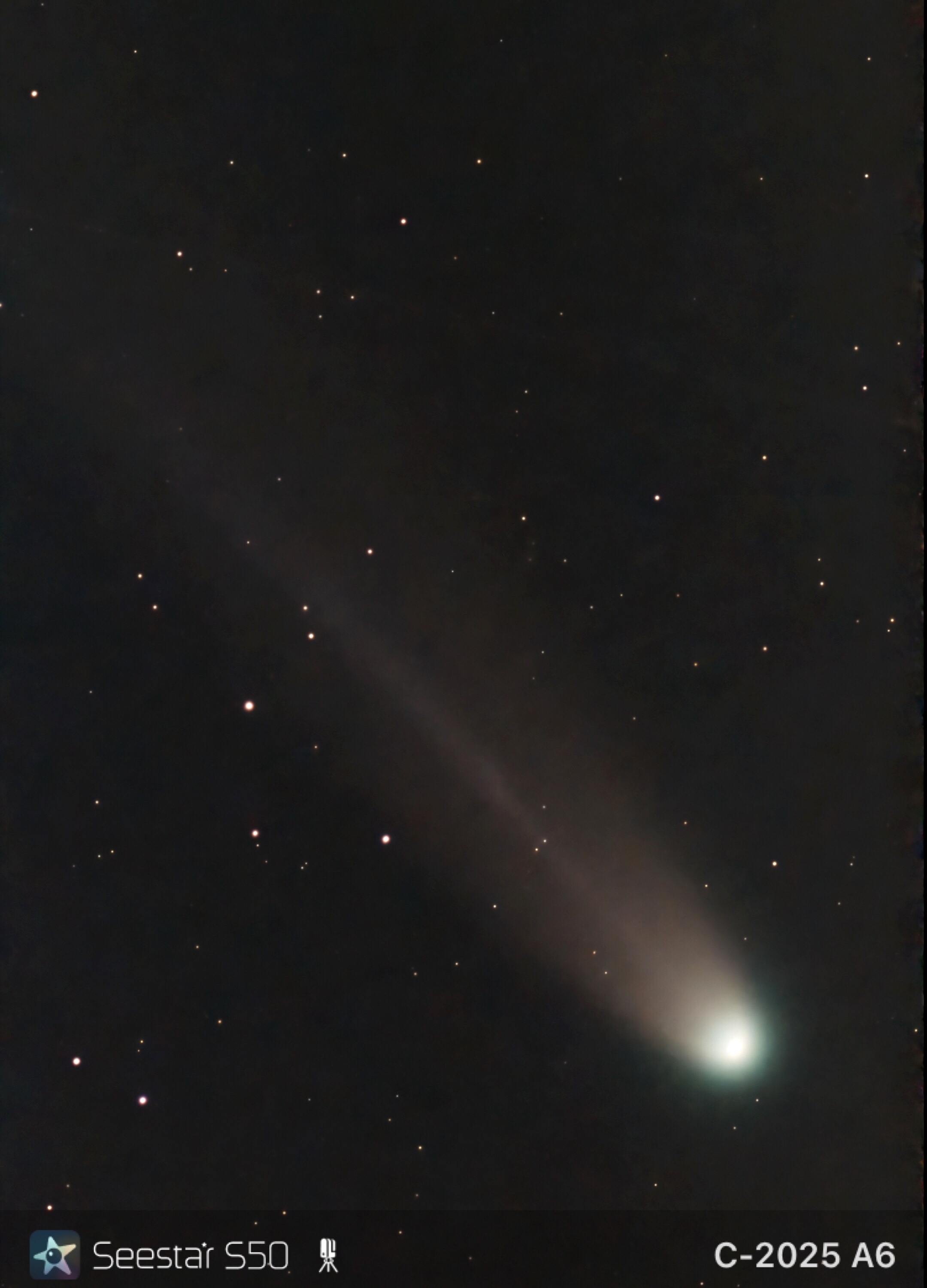 移動速度の早い彗星は、スマート望遠鏡本体では綺麗なスタッキングができず流れてしまいます。しかも Seestar S50は (そのままだと) 経緯台のため、メトカーフコンポジットが難しいです。数日前に撮影した時には、数百枚の生画像を無理やり Registax 6 でスタッキングしましたが、細い尾が写りませんでした。しかし、彗星が明るくなったため、本日は3分の露光 (手動のスタッキングなし) でしっかりと写りました。ただし、多少流れている間はあります。