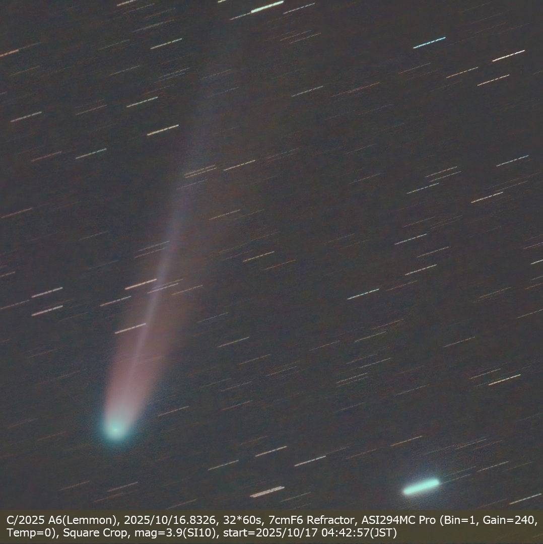 C/2025 A6(Lemmon), 2025/10/16.8326, 32*60s, 7cmF6 Refractor, ASI294MC Pro (Bin=1, Gain=240, Temp=0), Square Crop, mag=3.9(SI10) 撮影中の様子など → https://www.youtube.com/watch?v=KbRA3aAdMCE