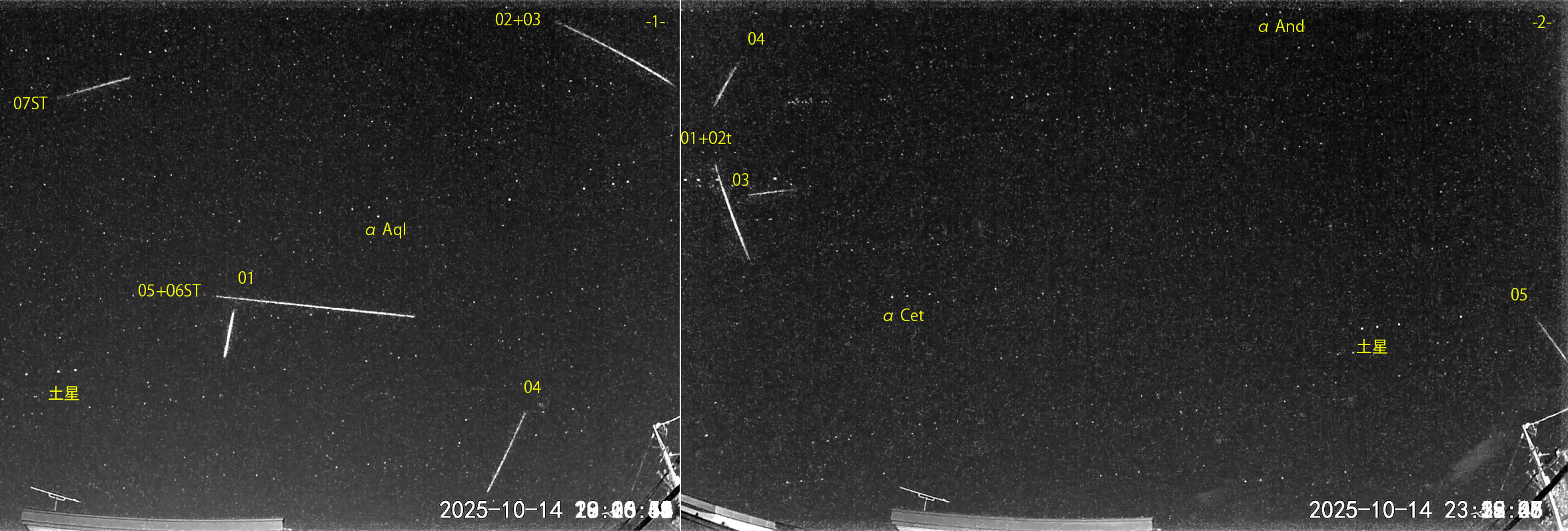 1) 18:30から約2時間の7コマを、2) 23:12から約1時間の5コマを処理しました。 出現した順に数字と記号を始点付近に記入。tは痕traceあり。O:オリオン座流星群、ST:おうし座南流星群
