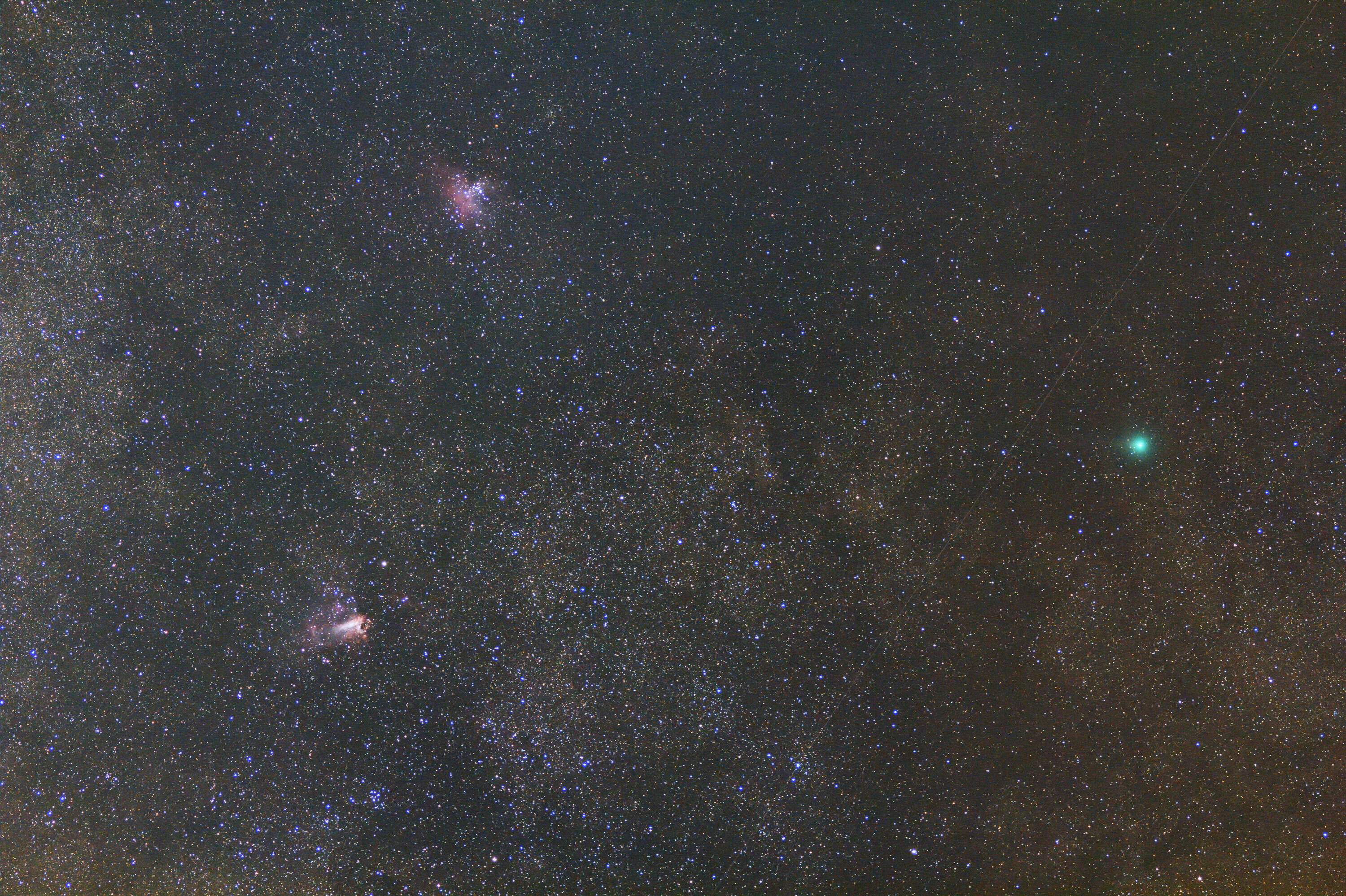 恒星基準でスタックしたので彗星は少し流れています。未改造ノーマルカメラなので赤い星雲の発色がおとなしい。雲が低空にあって少し霞んだ空でした。