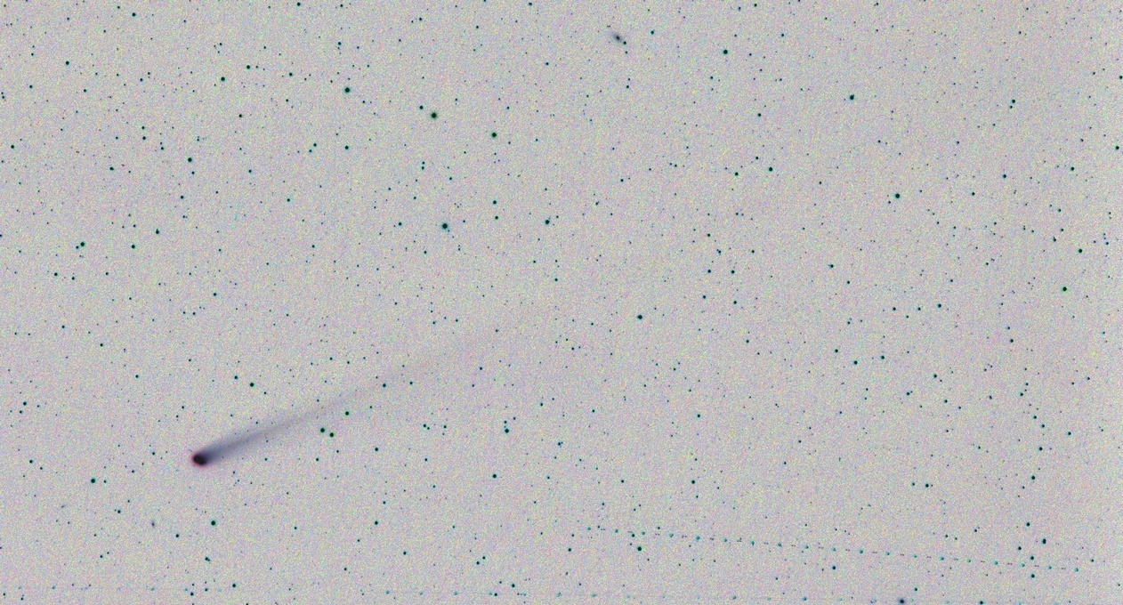 約30秒露出の21コマ をSequatorで合成 レベル調整、トーン調整、カラーバランス調整、リサイズ、彗星付近をトリミング 反転処理