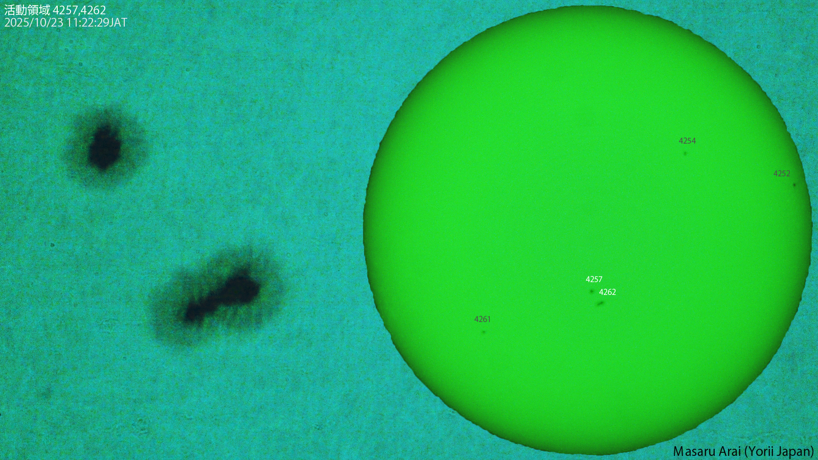SE120L+DMC-GH1よる、活動領域 4257 ( Cso/Dso ) 4262 ( Hsx/Hsx ) です。 NICT情報:活動領域4257などでCクラスフレアが数回発生し、最大のものは、活動領域4259で22日10時52分JSTに発生したC4.7フレアでした。