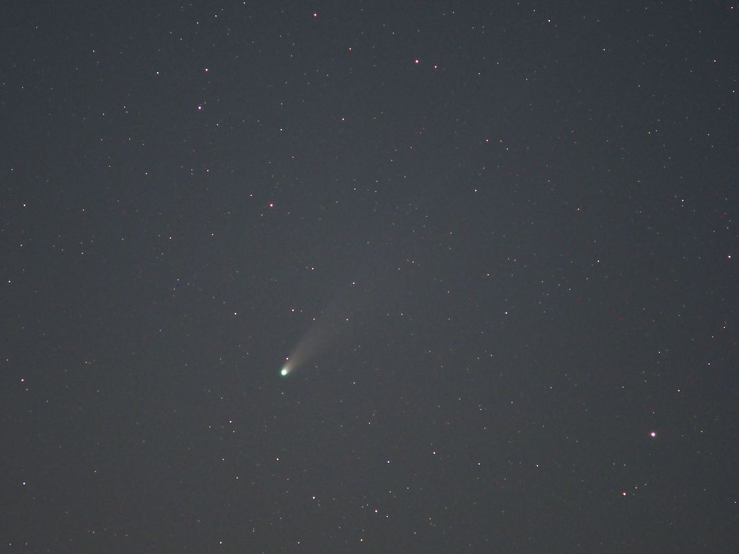 撮影地に到着したときには、目印の牛飼い座のアークトゥルスが山陰に沈んでしまって見えず、彗星を探すのに苦労しました。肉眼ではわかりませんでしたが8X30の双眼鏡で確認できました。うっすらと長い尾が出ています。