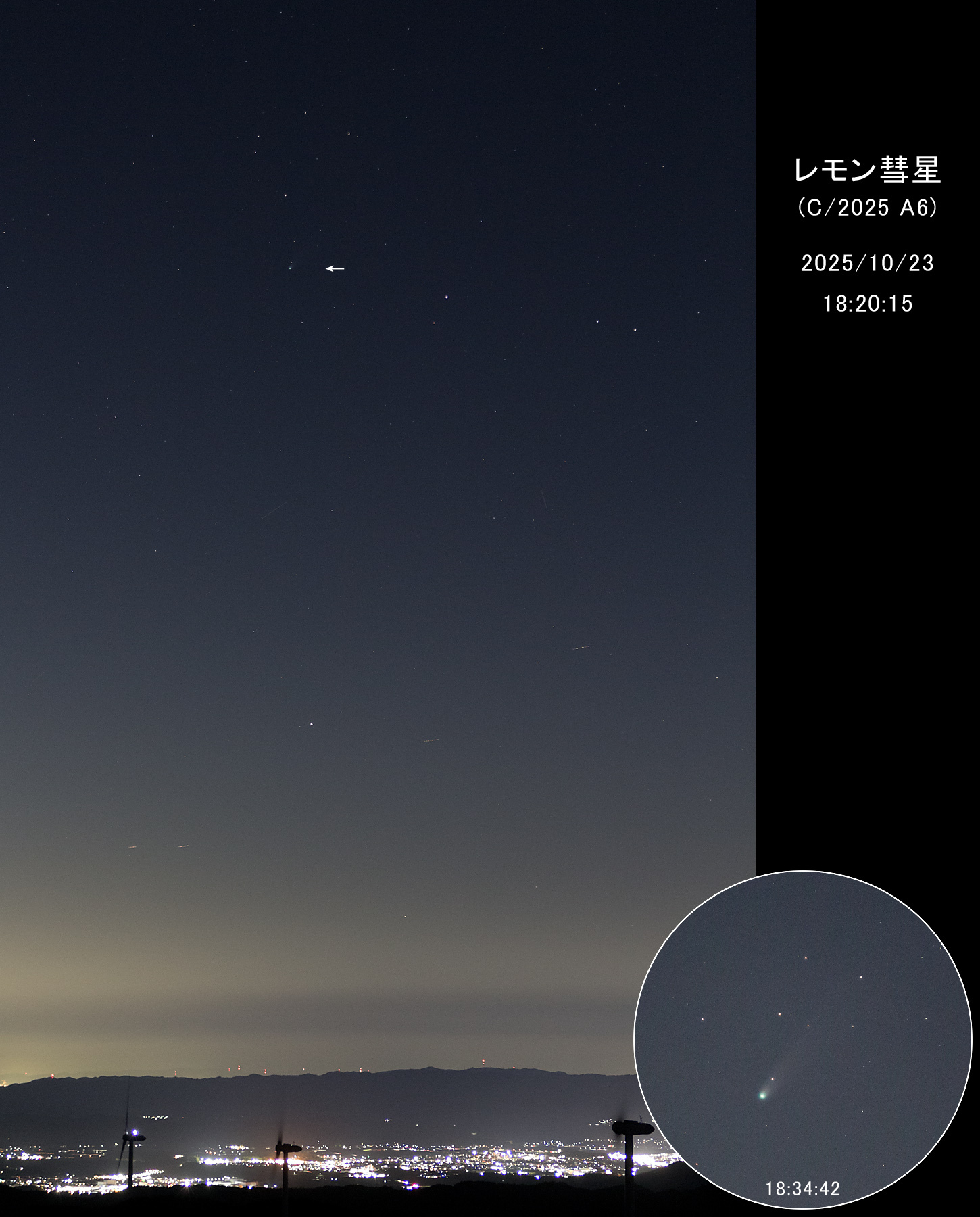 「彗星のアップ」画面右下の撮影データ。 撮影時間 18:34:42 smc PENTAX-A 1:2.8 135mm (PENTAX/EOSマウント変換アダプター)露出 5.0 秒 ISO 1600 絞り F2.8 ホワイトバランス AWB RAW(他の機材はメインカットと同じ)DNG RAWに変換後、Photoshop CS5にてRAW現像。リサイズ&アンシャープマスク後、円形トリミング。