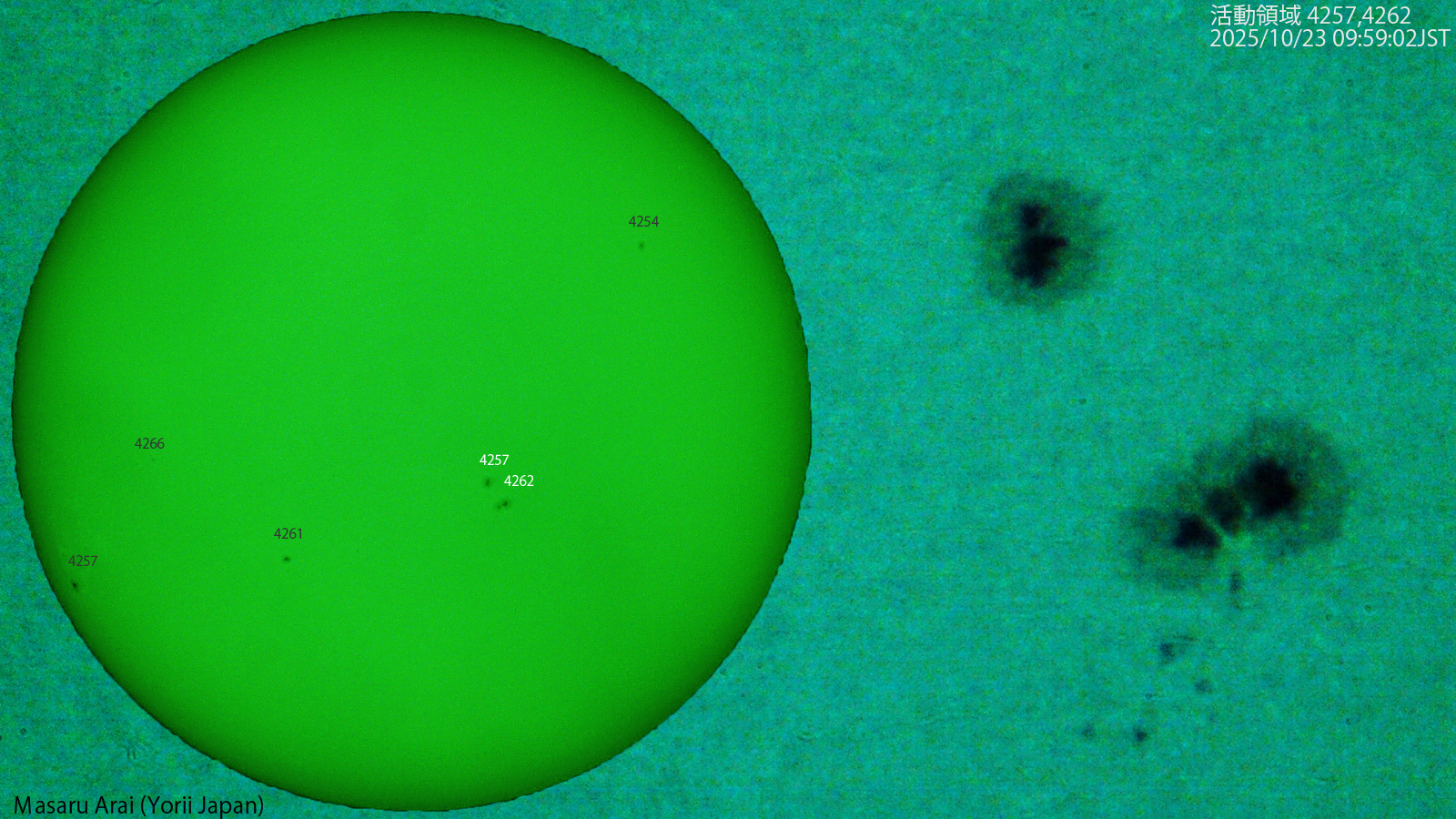 SE120L+DMC-GH1よる、活動領域 4257 ( Hsx/Hsx ) 4262 ( Hsx/Cai ) です。 NICT情報:活動領域4267などでCクラスフレアが数回発生し、最大のものは、太陽面で24日11時57分JSTに発生したC2.9/SFフレアでした。