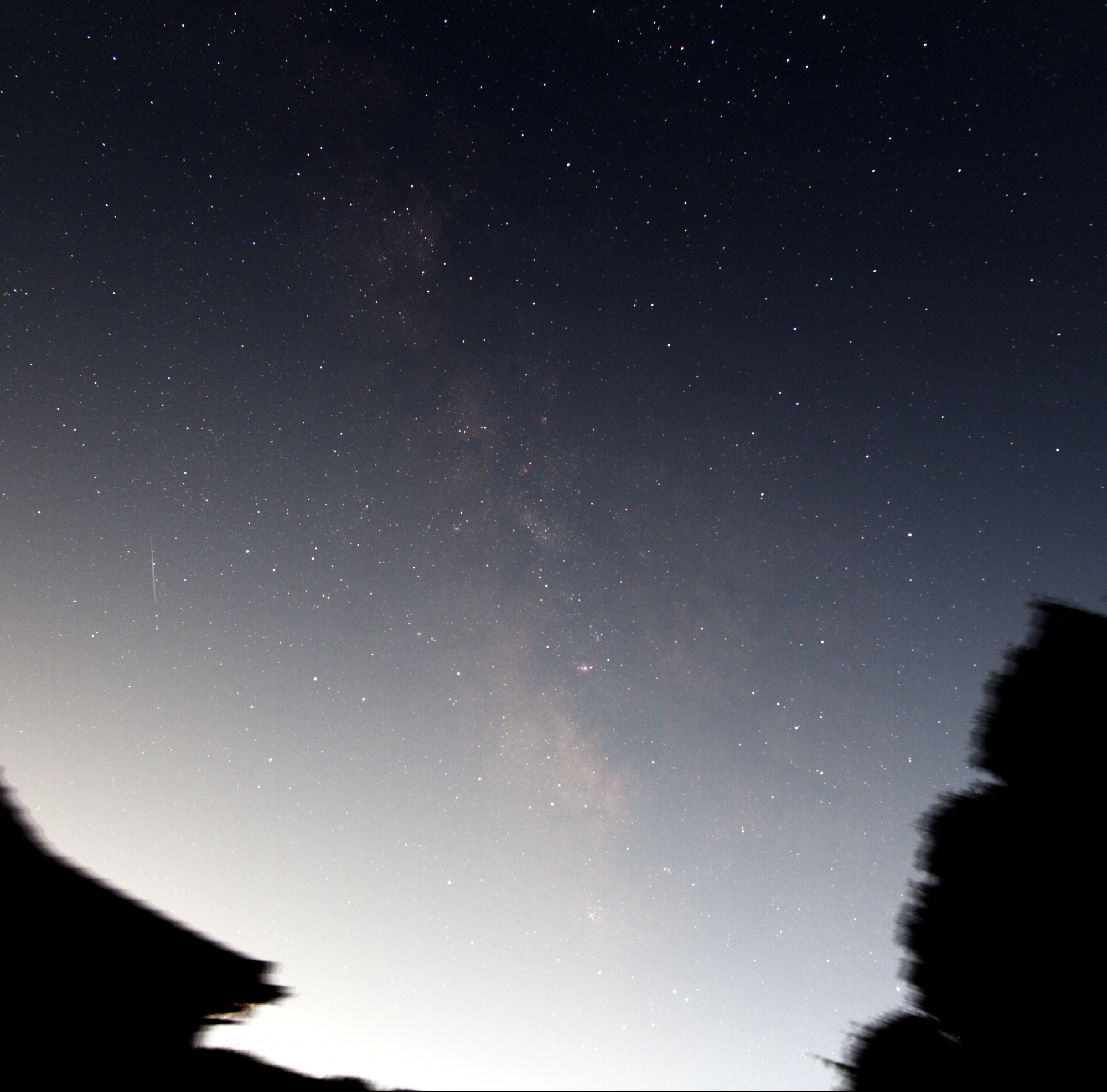 薄明が迫っていたし、赤道儀の調子があまり良くなかったので、露出時間を30秒にしました。光害が酷いらしく、カブリ補正でも補正しきれず、低空は完全に露出オーバーです。天の川の左側に流星か人工衛星と思しきものが写っています。