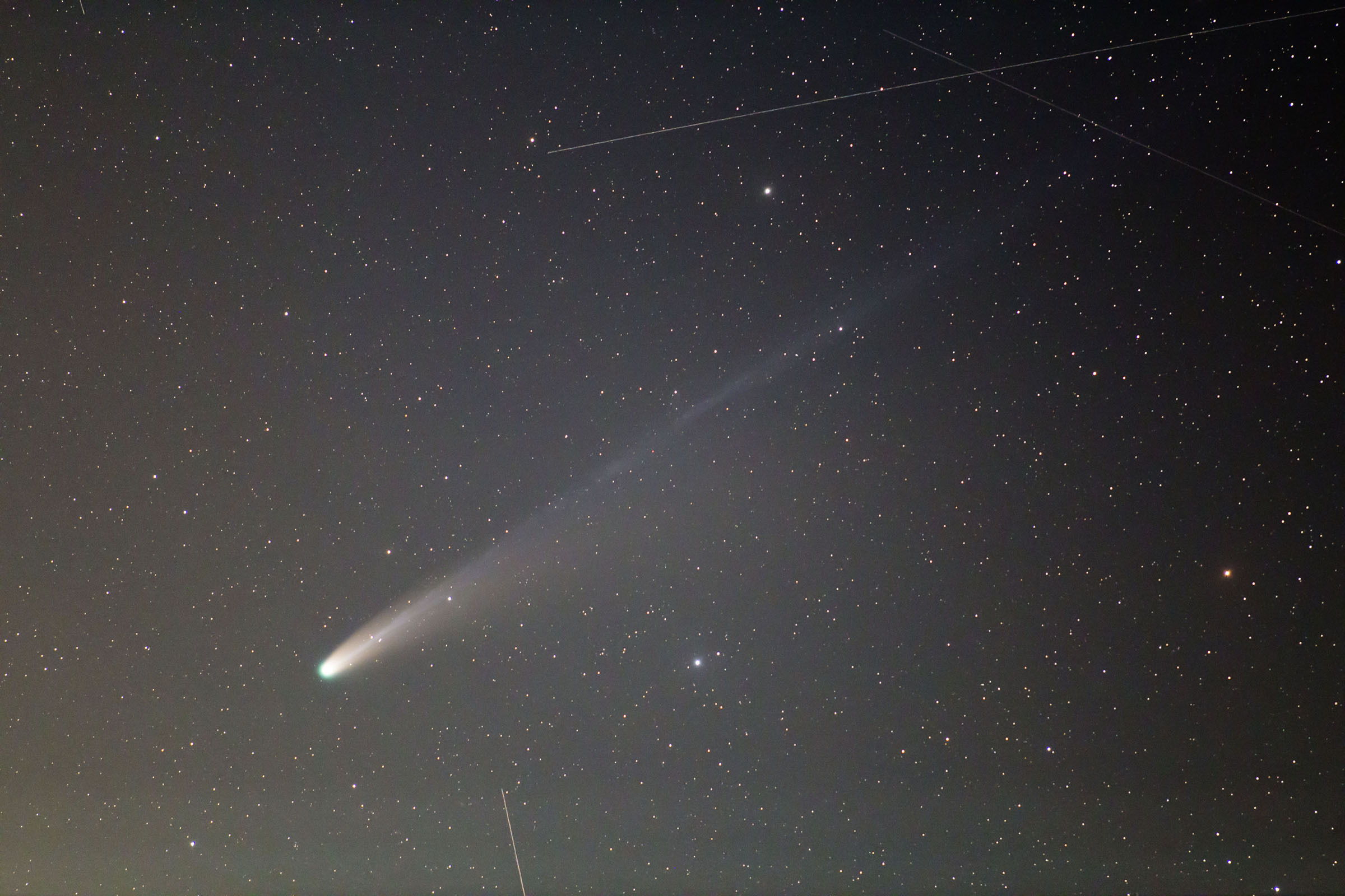 いつもの観測地が赤岳からの雲に覆われ、低空がよく見えないので、近くの平沢峠まで遠征?しました。峠は望遠鏡の砲列! 皆さんヒマですね(笑)三度目の正直で、やっとレモン彗星とご対面です。肉眼でも見え、5cm双眼鏡ではダストテールまではっきり見えました。写真ではイオンテールがずいぶん長く見えます。 それにしても、人工衛星の多いこと、写っていないコマはほとんどありません。増えるのは仕方ないとして、せめて低反射処理を義務づけるとかできないんでしょうか。