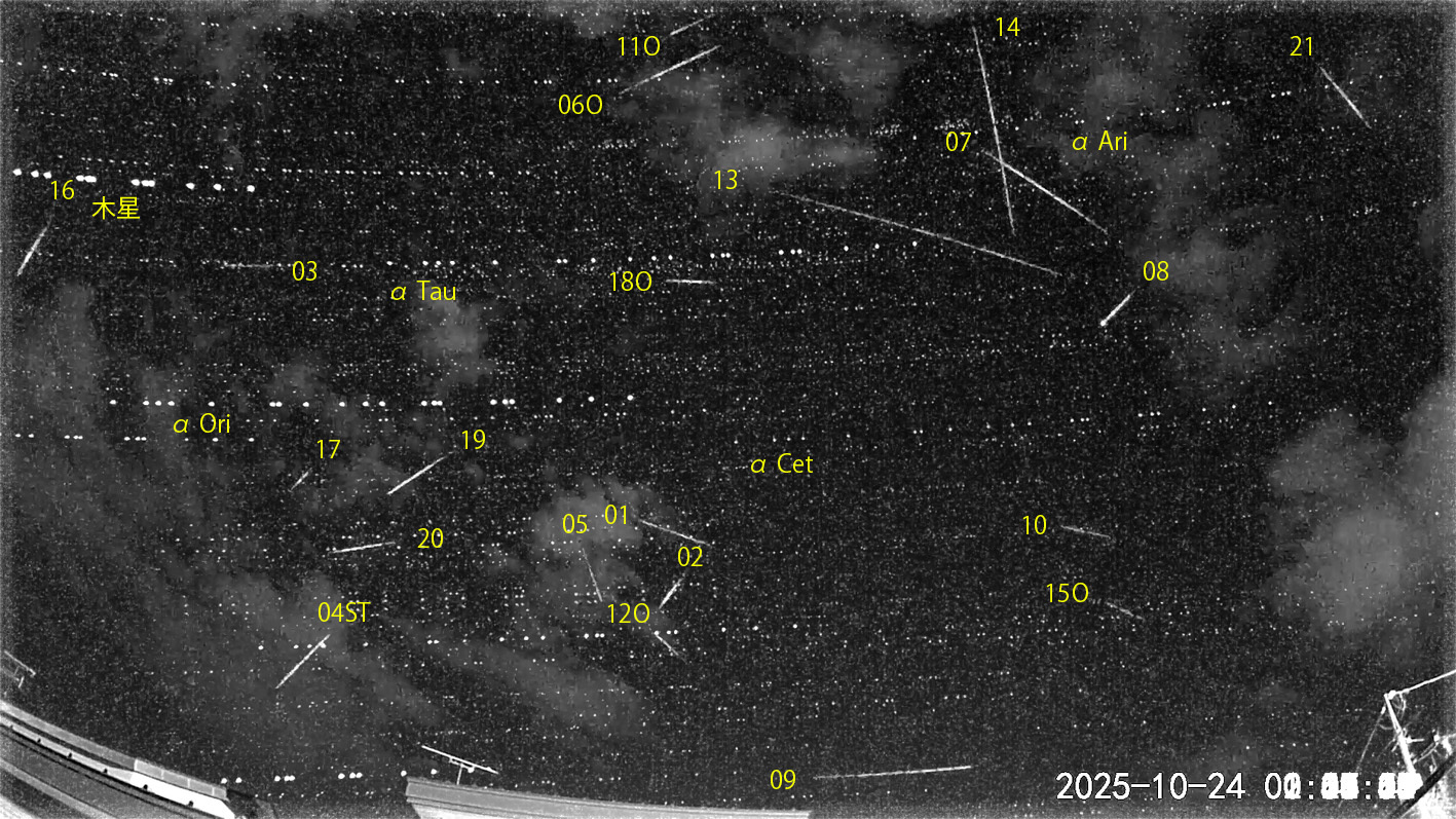 00:00から約2.5時間の21コマを処理しました。 出現した順に数字と記号を始点付近に記入。tは痕traceあり。O:オリオン座流星群、ST:おうし座南流星群 多数の流星が広範囲に出現したため、夜半後の画像が2枚となりました。