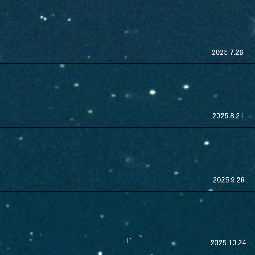 2025.7.26 → 15等級後半 2025.8.21 → 15等級前半 2025.9.26 → 15等級前半 2025.10.24 → 15等級後半 10月は減光したイメージです。 2025年10月27日が近日点ですが 地球との位置関係で2025年9月頃が明るさのピークでした。