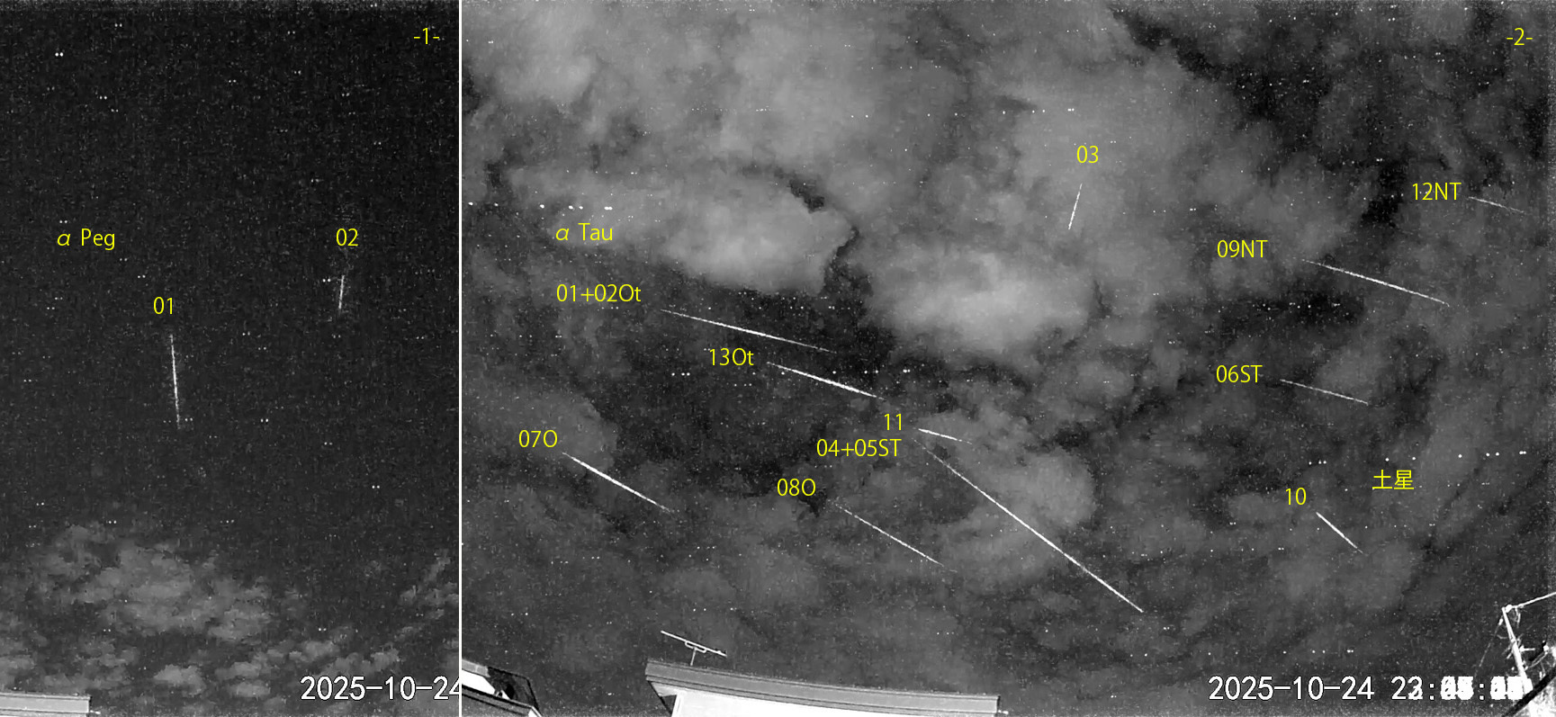 1) 20:08から約2時間の2コマを、2) 22:34から約1.5時間の13コマを処理しました。 出現した順に数字と記号を始点付近に記入。tは痕traceあり。O:オリオン座流星群、ST:おうし座南流星群、NT:おうし座北流星群 輻射点から遠いせいか、長経路の流星が多い。