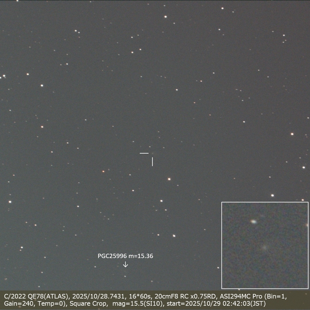 C/2022 QE78(ATLAS), 2025/10/28.7431, 16*60s, 20cmF8 RC x0.75RD, ASI294MC Pro (Bin=1, Gain=240, Temp=0), Square Crop, mag=15.5(SI10)
