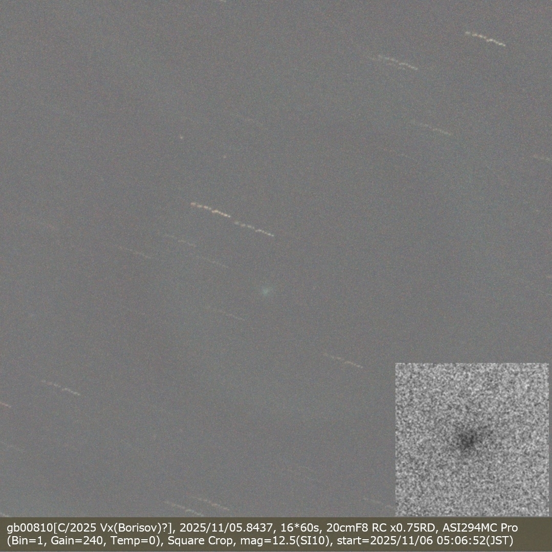 gb00810[C/2025 Vx(Borisov)?], 2025/11/05.8437, 16*60s, 20cmF8 RC x0.75RD, ASI294MC Pro (Bin=1, Gain=240, Temp=0), Square Crop, mag=12.5(SI10) 11月2日に発見された彗星候補天体を撮影してみました。満月のある低空のため写りは良くありません ※C/2025 V1(Borisov)になったようです。関連動画⇨ https://www.youtube.com/watch?v=Ev-ttftFhzQ