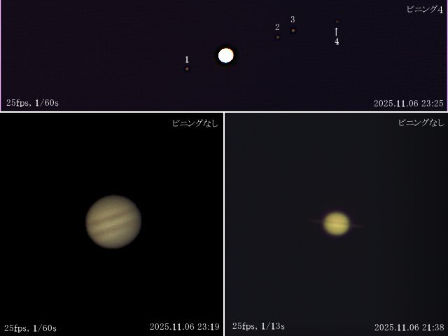 画像に示した条件で撮影した動画から、木星(ビニングなし)、木星(ビニング4)、土星でそれぞれスタック処理に1794枚、970枚、544枚を使ったので、露出に換算するとそれぞれ29.9秒、16.2秒、21.8秒となります。