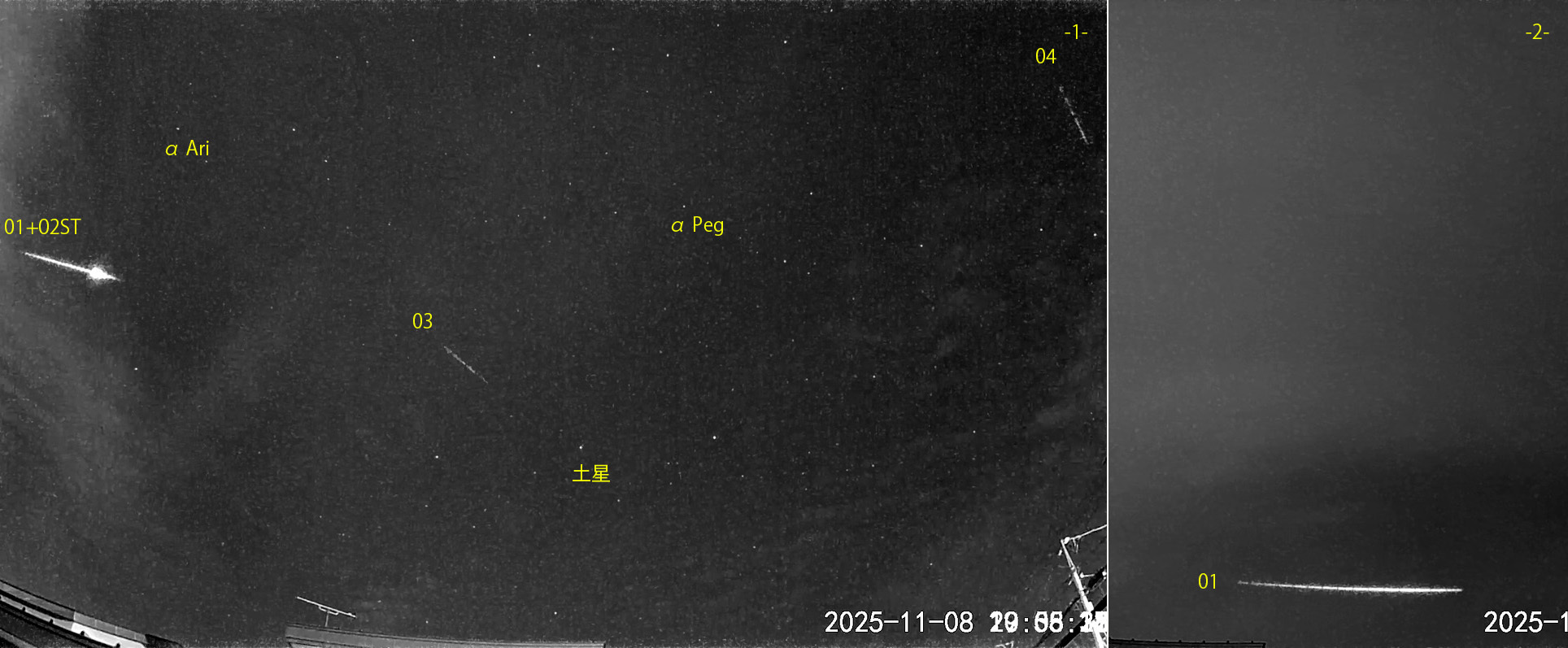 1) 19:05から約1.5時間の4コマを、2) 23:02の1コマを処理しました。薄雲が広がりました。 出現した順に数字と記号を始点付近に記入。tは痕traceあり。ST:おうし座南流星群、NT:おうし座北流星群、L:しし座流星群