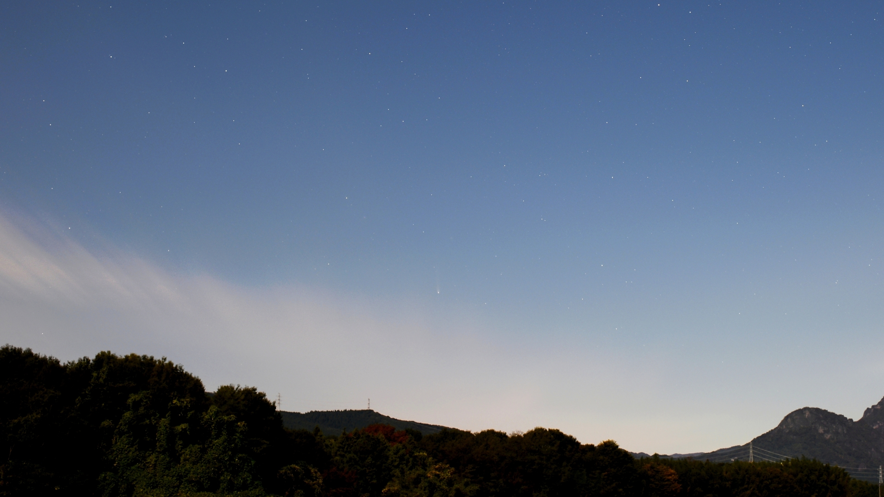 沈むレモン彗星を固定撮影で写してみました。レモン彗星は画面中央のやや下です。 満月近い月光で空は青く写りました。撮影後、空は曇ってしまいました。 彗星の予報光度は4.3等。月(月齢13.9)あり。(ステラナビゲータ12の値) (投稿日:2025/11/10)