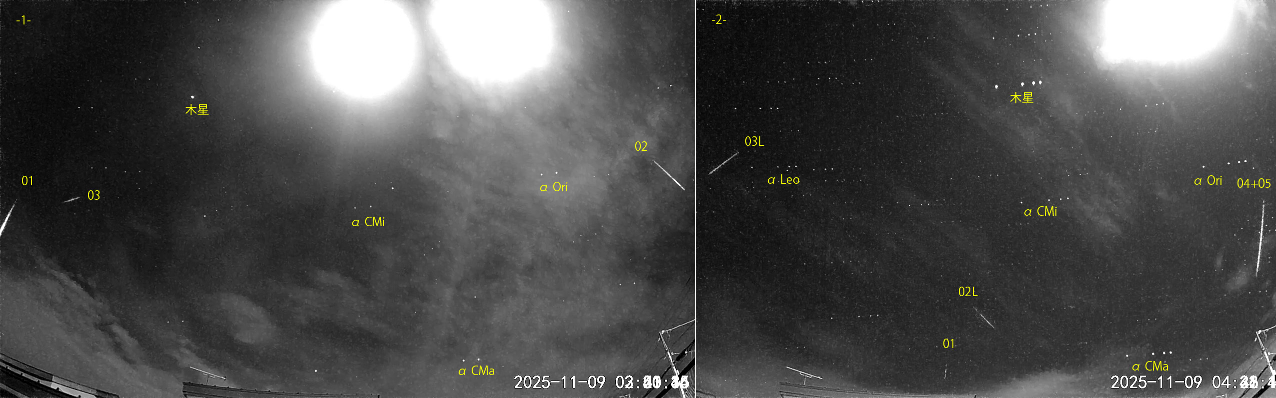 1) 02:20から約1.5時間の3コマを、2) 04:21から約0.5時間の5コマを処理しました。晴れたり曇ったりの天候でした。 出現した順に数字と記号を始点付近に記入。tは痕traceあり。ST:おうし座南流星群、NT:おうし座北流星群、L:しし座流星群 しし座群が出現するようになりました。