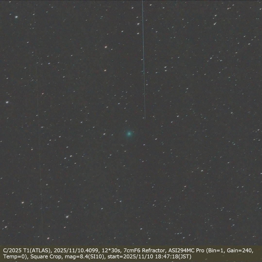 C/2025 T1(ATLAS), 2025/11/10.4099, 12*30s, 7cmF6 Refractor, ASI294MC Pro (Bin=1, Gain=240, Temp=0), Square Crop, mag=8.4(SI10) 御立岬にレモン彗星の撮り納にいきましたが、雲だらけでした https://www.youtube.com/watch?v=NBf6zkECvg8