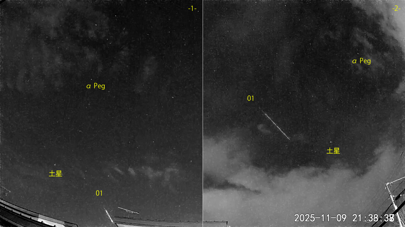 1) 17:10の1コマを、2) 21:38の1コマを処理しました。20時頃より雲が多くなり、22時過ぎには雨となりました。 出現した順に数字と記号を始点付近に記入。tは痕traceあり。ST:おうし座南流星群、NT:おうし座北流星群、L:しし座流星群