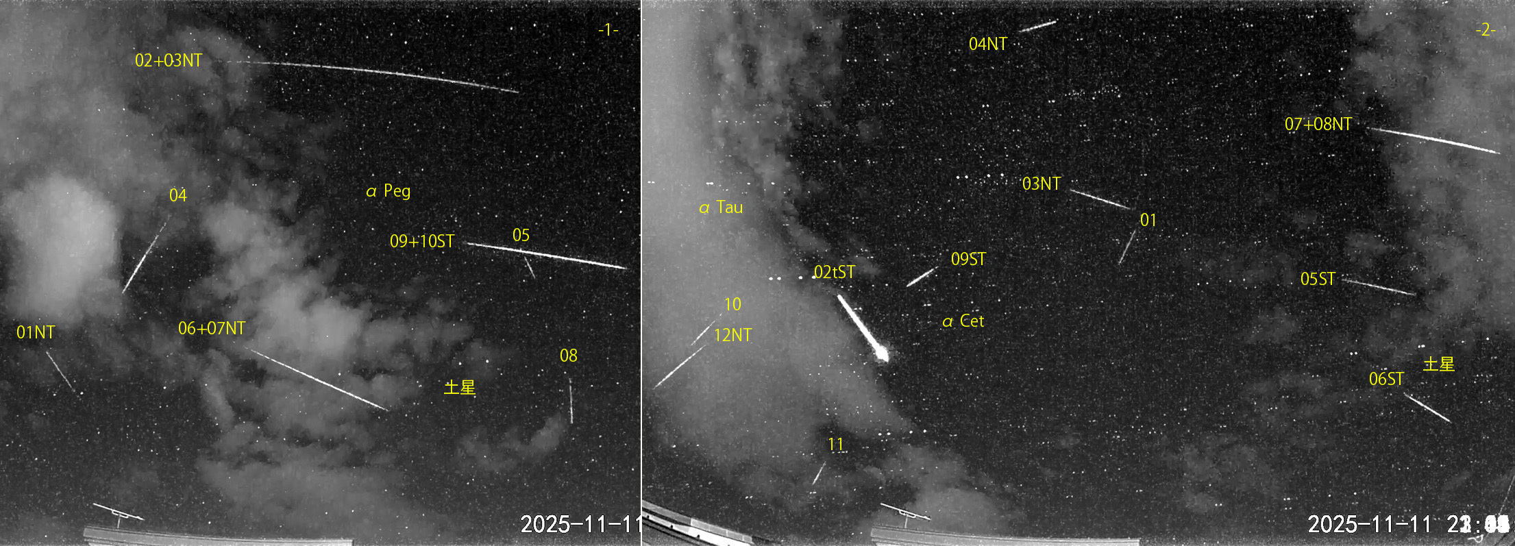1) 17:49から約3時間の10コマを、2) 21:14から約2.5時間の12コマを処理しました。流れ雲が多い宵でした。 出現した順に数字と記号を始点付近に記入。tは痕traceあり。ST:おうし座南流星群、NT:おうし座北流星群、L:しし座流星群