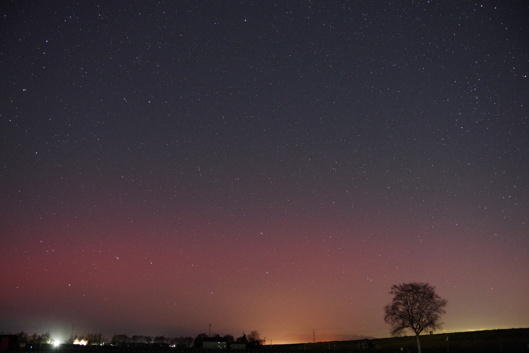 肉眼でも北の低空がほんのり明るく、わずかに赤いと感じました。画像下に下方通過中の北斗七星、上辺少し左に北極星が写っています。なおセンサーサイズが小さいので 35mm フルサイズ 27mm 相当の画角です。